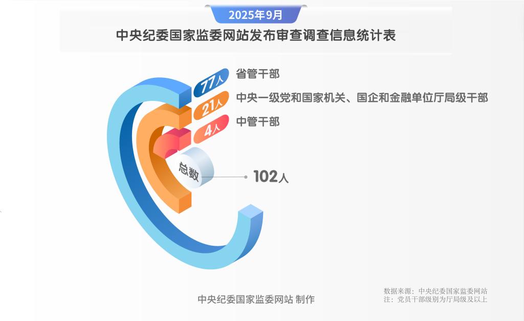 2025年9月,中央纪委国家监委网站共发布102名党员、干部接受审查调查信息。其中,中管干部4名,中央一级党和国家机关、国企和金融单位厅局级干部21名,省管干部77名。
