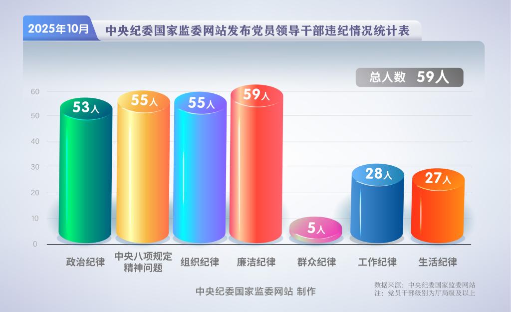 2025年10月,中央纪委国家监委网站发布的党纪政务处分信息中,被通报的59名党员、干部均违反廉洁纪律,55人违反中央八项规定精神,53人违反政治纪律,55人违反组织纪律,5人违反群众纪律,28人违反工作纪律,27人违反生活纪律。