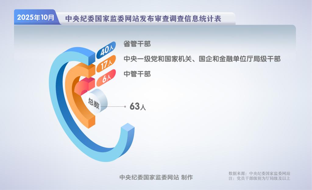 2025年10月,中央纪委国家监委网站共发布63名党员、干部接受审查调查信息。其中,中管干部6名,中央一级党和国家机关、国企和金融单位厅局级干部17名,省管干部40名。