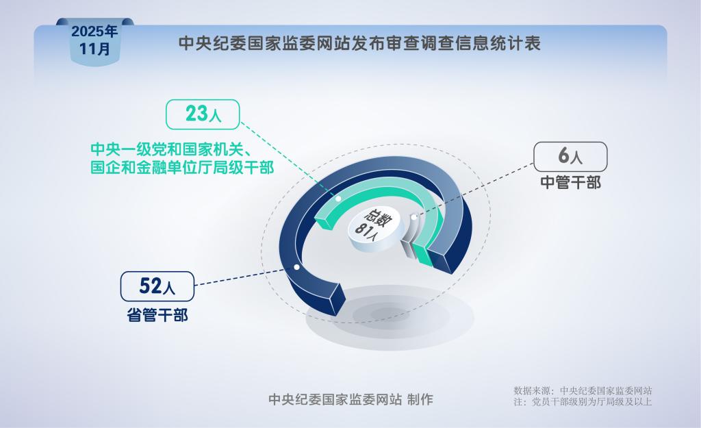 2025年11月,中央纪委国家监委网站共发布81条审查调查信息。其中,中管干部6人,中央一级党和国家机关、国企和金融单位厅局级干部23人,省管干部52人。