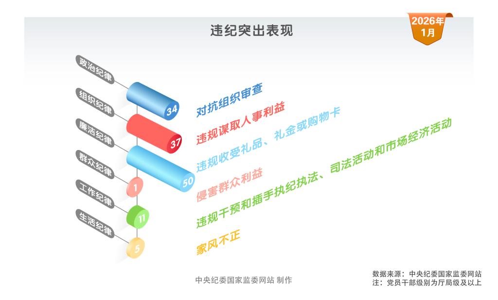 2026年1月,中央纪委国家监委网站通报的52名被处分党员、干部中,有47人存在违反政治纪律问题,其中34人存在对抗组织审查行为;在违反组织纪律行为中,违规谋取人事利益占比最高,有37人存在该违纪行为;违反廉洁纪律的50人均存在违规收受礼品、礼金或购物卡的行为;在违反工作纪律行为中,违规干预和插手执纪执法、司法活动和市场经济活动是突出违纪表现。