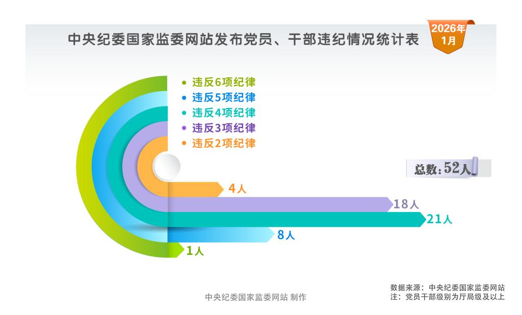 2026年1月,中央纪委国家监委网站发布的52条党纪政务处分信息中,47人违反政治纪律,52人违反中央八项规定精神,48人违反组织纪律,50人违反廉洁纪律,2人违反群众纪律,22人违反工作纪律,23人违反生活纪律。