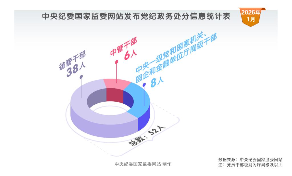 2026年1月,中央纪委国家监委网站共发布52条党纪政务处分信息。其中,中管干部6人,中央一级党和国家机关、国企和金融单位厅局级干部8人,省管干部38人。